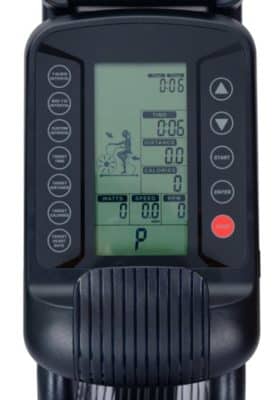LCD-displayet på Airbike PRO NORGYM viser tid, distance, kalorier, watt, hastighed, RPM, og pulsen hvis du har et trådløst pulsbælte.