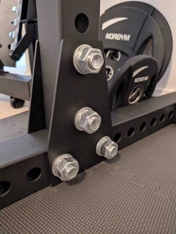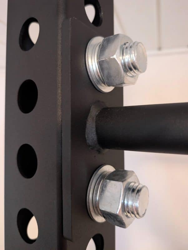 Målene på al stålet svarer til Hammer Strength (75 mm x 75 mm x 3mm) og boltene er ligeledes meget større og mere solide end de behøver at være, så hele racket er absolut stabilt. J-hooks og sikkerhedsarmene er også i samme høje kvalitet og umulige at slide op.
