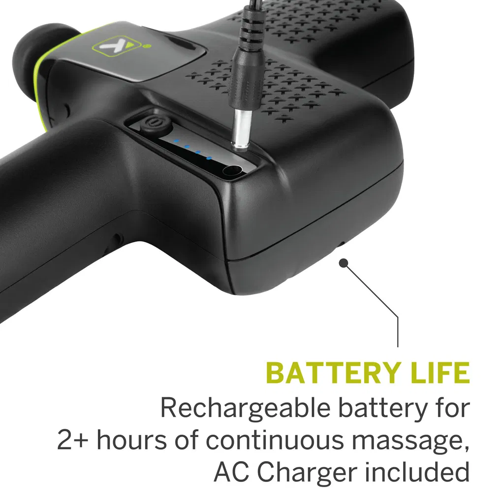 Med et genopladeligt batteri, kan Trigger Point Therapy Impact massagepistolen bruges i over to timer ved kontinuerlig brug før den skal genoplades.